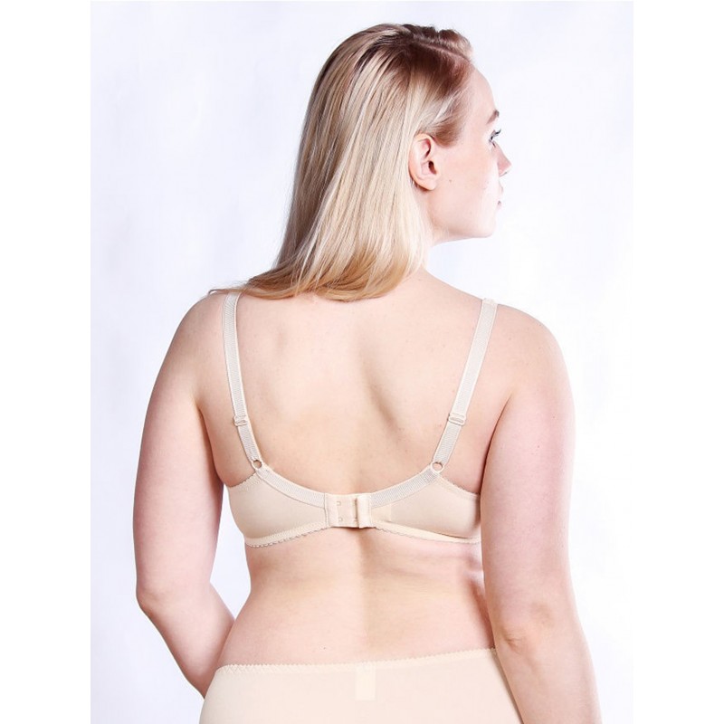 Бюстгальтер хлопковый с плотной чашкой из поролона на каркасах. Изготовлен из сетчатого полотна. Благодаря использованию только натуральных хлопковых полотен бюстгальтер обладает гипоаллергенными свойствами. Выполнен из эластичного хлопкового полотна. Чашка с горизонтальных швом приподнимает и округляет грудь. Внутри чашки кармашки для вкладышей пуш-ап. U-образное расположение бретелей. Бретели из эластичной ленты с регулировкой по длине. Застёжка сзади на крючки и петли, 2*3 крючка. Декоративный элемент – украшение на ластовице.