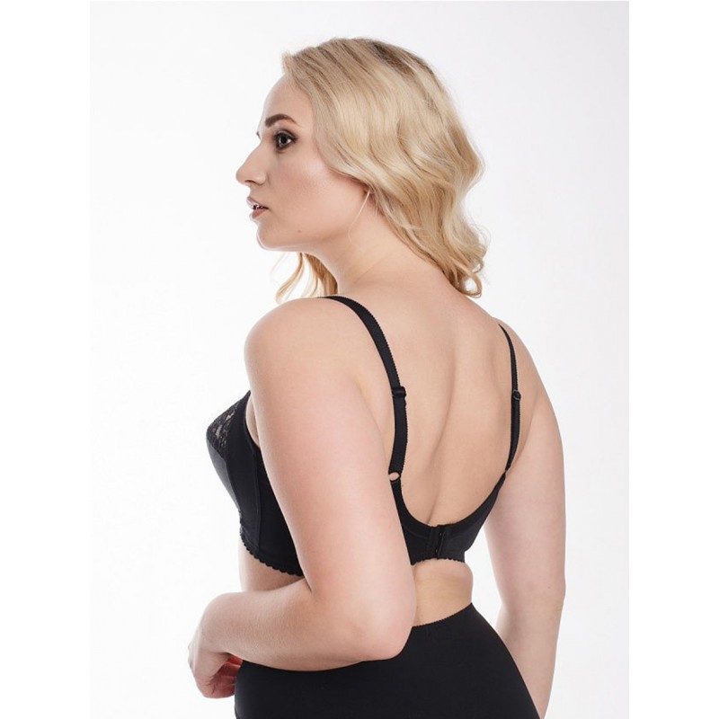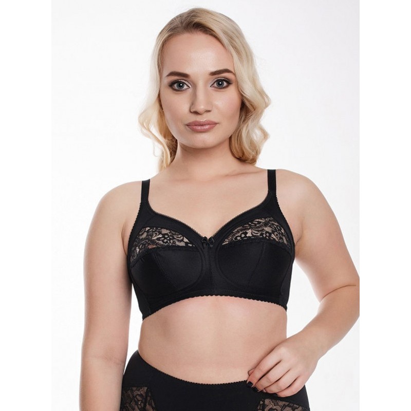 Бюстгальтер без каркасов больших размеров. Крой бюстгальтера выполнен с учетом особенностей груди большого размера. Бюстгальтер без каркасов на мягкой чашке с хлопковой подкладкой. Чашка с горизонтальным швом и отделкой из кружева по верху, формирует и приподнимает грудь, придавая анатомическую форму. Усиленная бретель распределяет силу нагрузки на плечи. U-образное расположение бретелей. Бретели из эластичной ленты с регулировкой по длине. Застёжка сзади на крючки и петли, 2*3 крючка. Декоративный элемент – бант на ластовице.