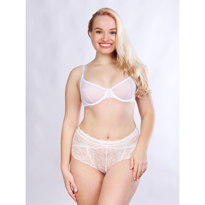 Кружевные трусы высокие больших размеров. Трусы выполнены из эластичного цветочного кружева. Подчеркивают и элегантно облегают фигуру. Комбинация кружевных элементов составляет элегантный рисунок с выемкой на задней части изделия. Верх изделия и ластовица обработаны эластичной резиной. По низу кружевной край без обработки.  Хлопковая ластовица.