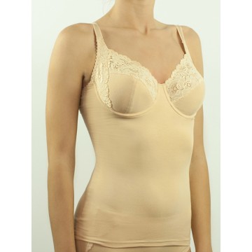 Майка женская хлопковая без рукавов, на тонких бретелях, с регулировкой по длине. Изготовлена из мягкого эластичного хлопка, чашка из плотной микрофибры. Чашка на каркасах, с отделкой из кружева по верху. Чашка закрытая, с Т-образным швом, собирает и округляет грудь, делая идеальное декольте.