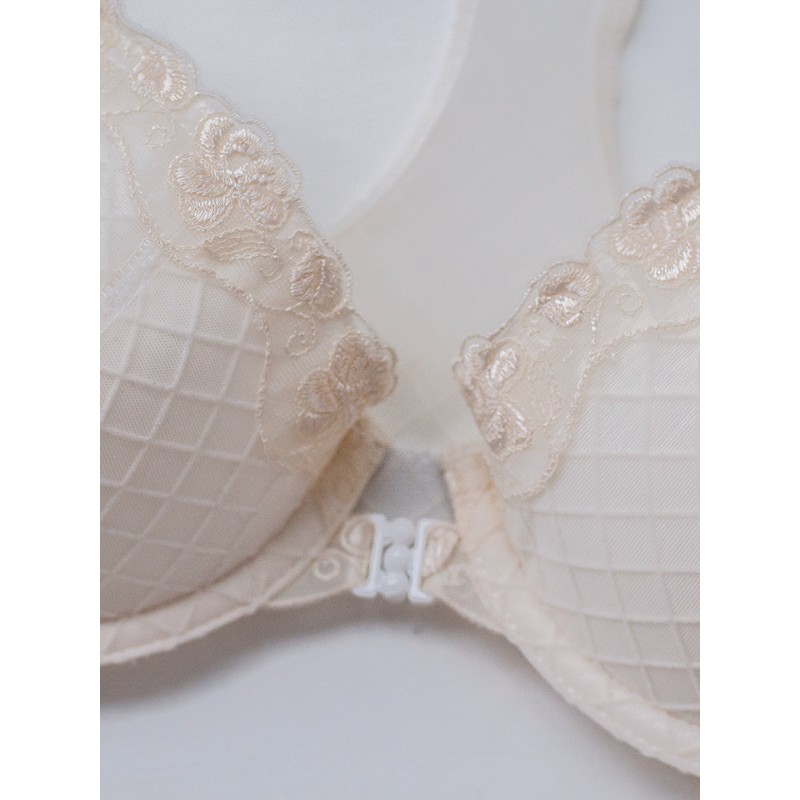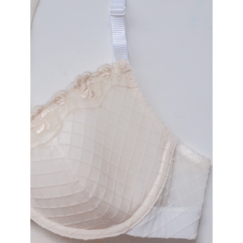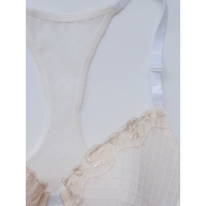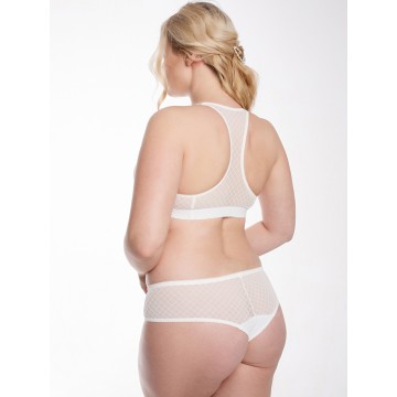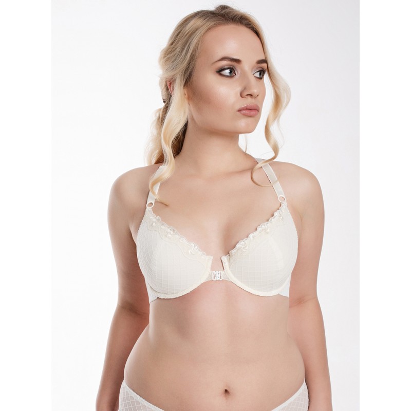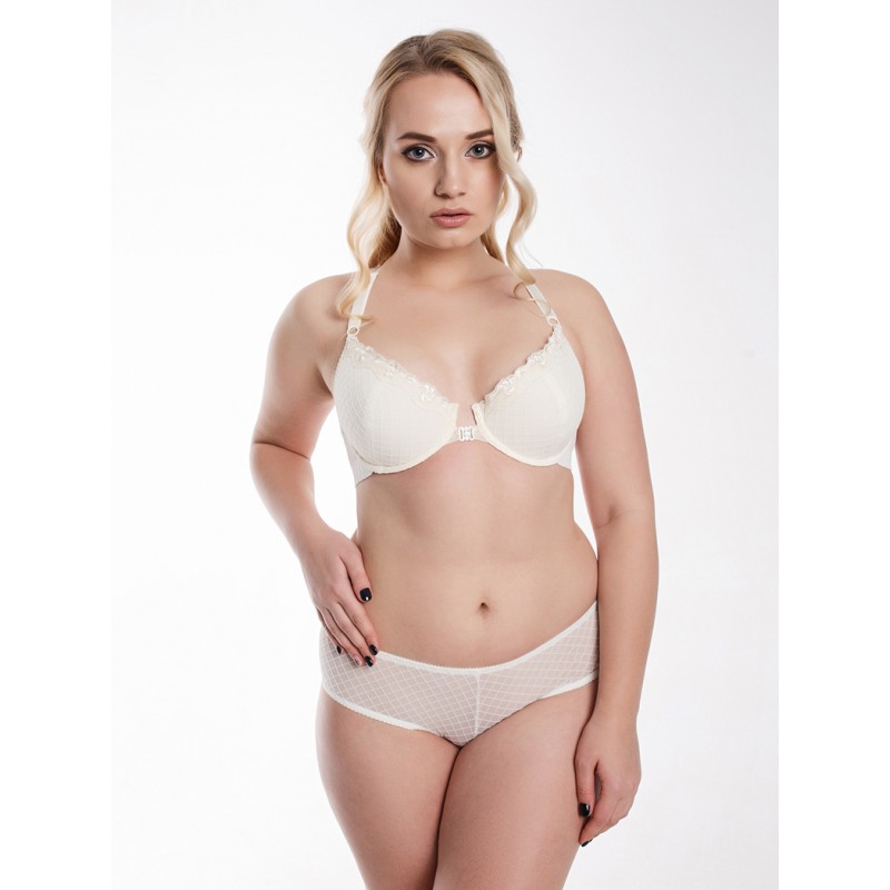 Хлопковый бюстгальтер на каркасах. Чашка дублированная (тонкий поролон) приподнимает и округляет грудь. Выполнен из сетчатого полотна. Чашка с горизонтальным швом и узким кружевом по верху деликатно подчёркивает форму. Широкая эластичная лента по стану, благодаря которому бюстгальтер отлично держит грудь. Спинка-борцовка, пластмассовая застёжка спереди. Бретели регулируются по длине.