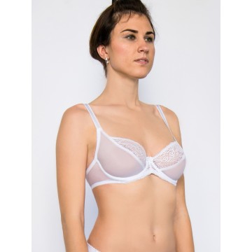 Бюстгальтер из прозрачной сетки с кружевом Мягкая чашка На каркасах Комбинация кружева и сетки Прямоугольное расположение бретелей Естественное положение груди Размерный ряд:75A 75B 75C 75D 80A 80B 80C Состав:84% полиамид, 16% эластан Цветовая гамма: белый (11101), черный (11201)