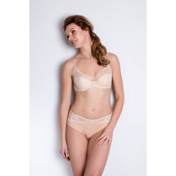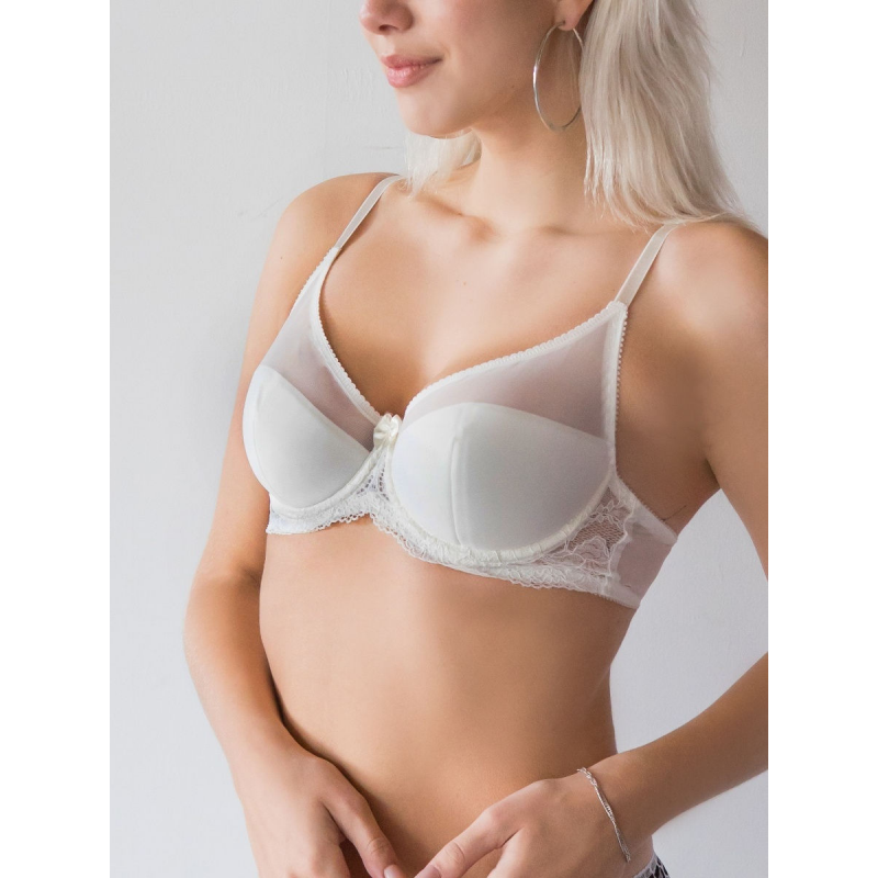 Бюстгальтер из сетки с кружевом.Чашка дублированная полупоролон, на каркасах, с хлопковой подкладной внутри.Чашка высокая закрытая с вертикальным швом. Выполнен из прозрачного сетчатого полотна, ластовица кружевная. Застёжка 2*3 крючка. Классическое прямоугольное расположение бретелей с регулировкой по длине. Декоративный элемент - бант по ластовице.