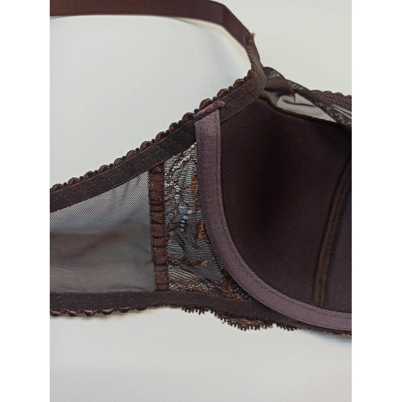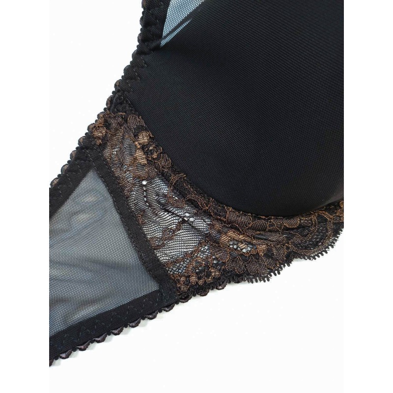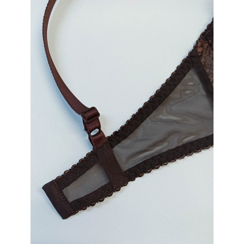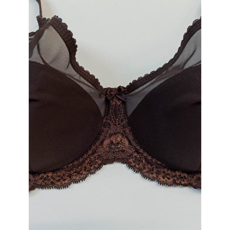 Бюстгальтер из сетки с кружевом.Чашка дублированная полупоролон, на каркасах, с хлопковой подкладной внутри.Чашка высокая закрытая с вертикальным швом. Выполнен из прозрачного сетчатого полотна, ластовица кружевная. Застёжка 2*3 крючка. Классическое прямоугольное расположение бретелей с регулировкой по длине. Декоративный элемент - бант по ластовице.