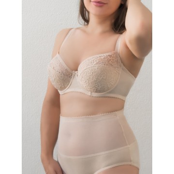 Кружевной бюстгальтер балконет на  каркасах, больших размеров. Крой бюстгальтера выполнен с учетом особенностей груди большого размера. Чашка дублированная тонким поролоном (внутренняя часть хлопковая) приподнимает и округляет грудь. Чашка выполнена из цветочного кружева. Расширенный стан выполнен из плотного функционального трикотажного полотна. U-образное расположение бретелей. Бретели из эластичной ленты с регулировкой по длине. Застёжка сзади на крючки и петли, 2*3 крючка.