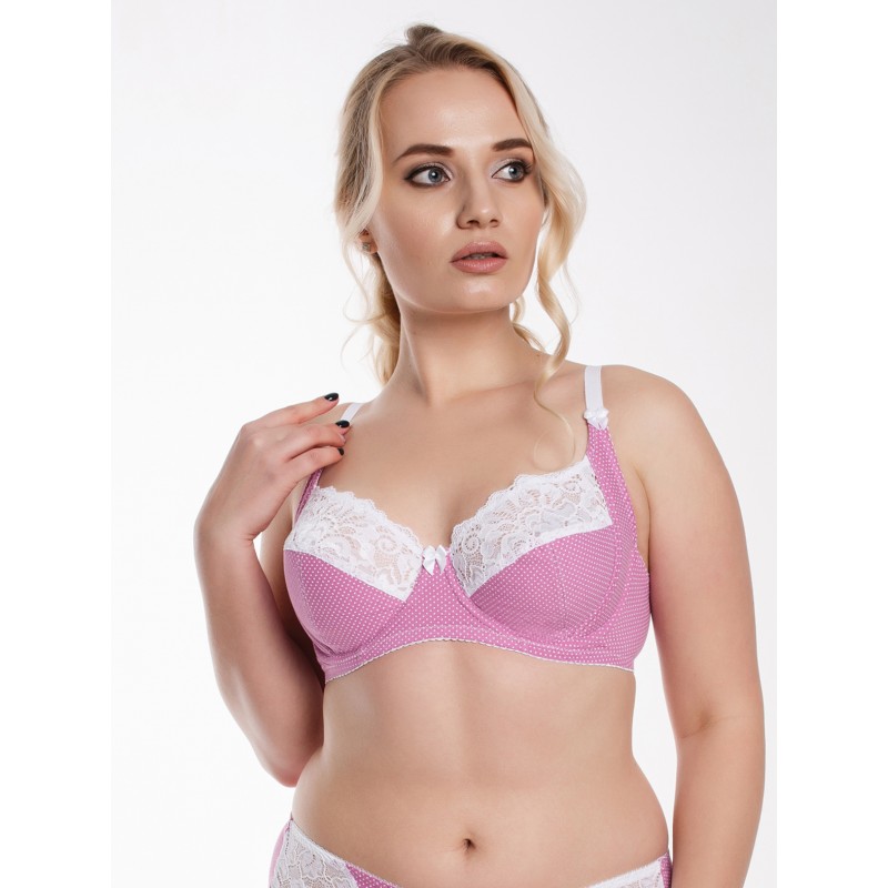 Хлопковый бюстгальтер на мягкой чашке большой размерной группы. Крой бюстгальтера выполнен с учетом особенностей груди большого размера. Чашка на каркасах из плотного хлопкового полотна на хлопковой подкладке приподнимает и округляет грудь, Т-образный шов чашки с боковой поддержкой из дублированного полотна позволяет формировать грудь к центру. Верх чашки декорирован элегантным кружевом. Расширенный стан выполнен из плотного функционального хлопкового полотна. U-образное расположение бретелей с регулировкой по длине. Застёжка 2*3 крючка. Декоративный элемент - бант на ластовице и бретелях.