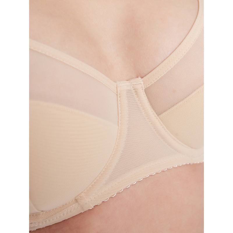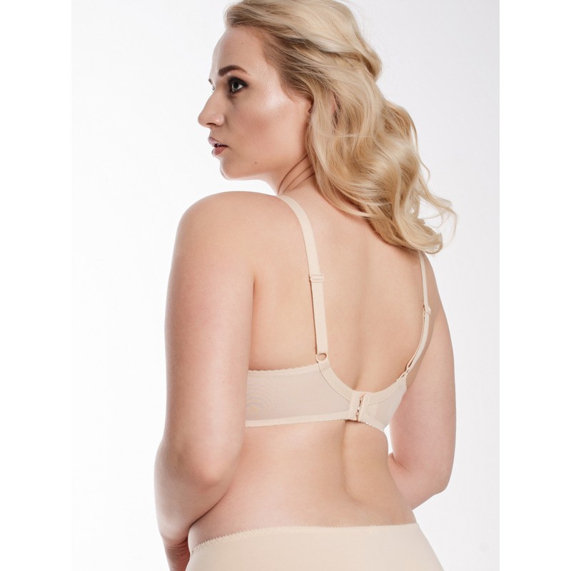 Классический бюстгальтер из сетки. Чашка полупоролон на каркасах. Крой бюстгальтера выполнен с учетом особенностей груди большого размера. Бюстгальтер изготовлен из функционального прозрачного сетчатого полотна. Чашка дублированная тонким поролоном, с Т-образным швом формирует и округляет грудь. U-образное положение бретелей с регулировкой по длине. Застёжка 2*3 крючка.