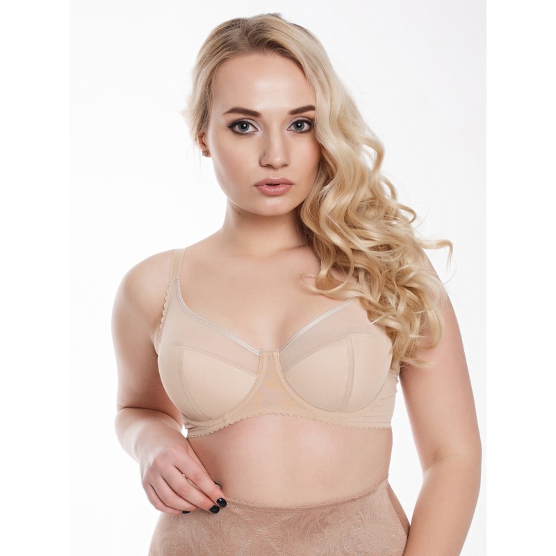 Классический бюстгальтер из сетки. Чашка полупоролон на каркасах. Крой бюстгальтера выполнен с учетом особенностей груди большого размера. Бюстгальтер изготовлен из функционального прозрачного сетчатого полотна. Чашка дублированная тонким поролоном, с Т-образным швом формирует и округляет грудь. U-образное положение бретелей с регулировкой по длине. Застёжка 2*3 крючка.